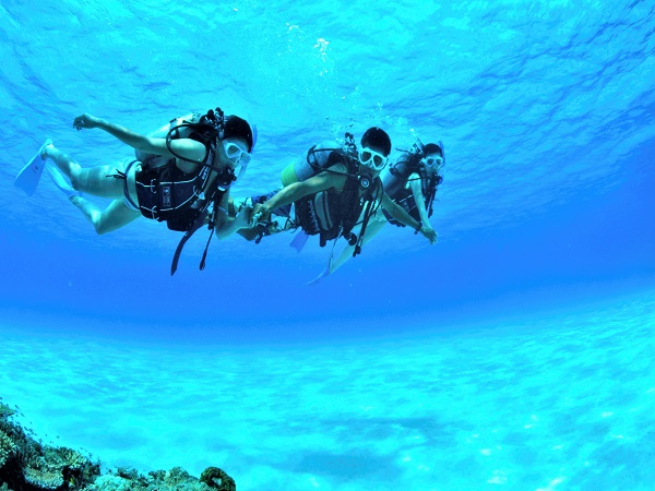 透明度の高い八重山の海で体験ダイビング。泳ぎに自信のない方も安心して体験できます。